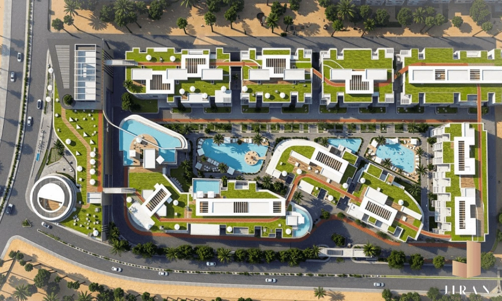 أما الجزء المخصص للمباني السكنية، فقد جرى تصميمه بدقة عالية وبأسلوب هندسي عصري يوفّر انسيابية بين الوحدات، مع حرص على أن تحظى كل وحدة بإطلالة مميزة على المساحات المفتوحة، مما يعزز من إحساس الخصوصية والهدوء داخل الكمبوند.
