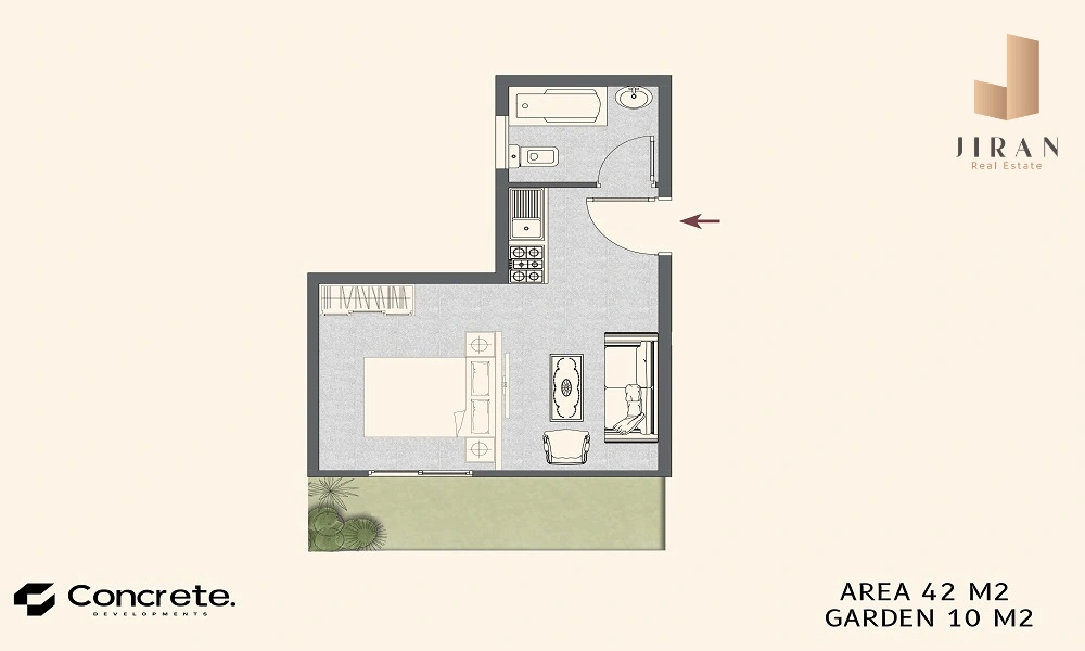 ستوديو مساحة 42 متر مربع, بجاردن بمساحة 10 متر مربع